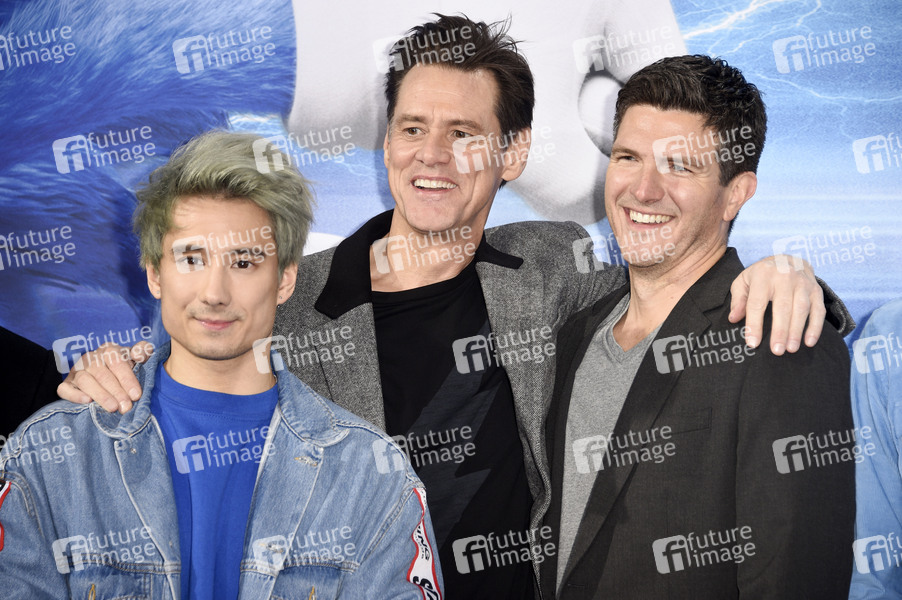 Julien Bam, Jim Carrey und Jeff Fowler beim Fan & Family Event 'Sonic the Hedgehog' im Zoo Palast. Berlin, 28.01.2020