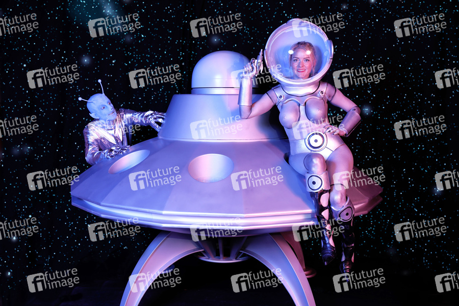 GEEK ART - Bodypainting and Transformaking: UFO Photoshooting mit Daniela Buchholz als Space Girl und Enrico Lein als Außerirdischer mit einem UFO im Filmwelt Center. Bad Münder, 13.10.2021 - Ein Projekt des Fotografen Tschiponnique Skupin und des Bodypainters und Transformakers Enrico Lein