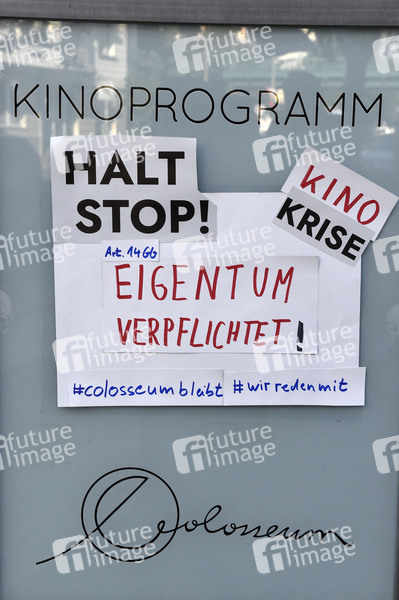 Protestaktion der Mitarbeiter gegen die geplante Schließung des Kinos Colosseum. Mit Aktionen wie dieser wollen die Mitarbeiter und Anwohner die Schließung verhindern. Ihrer Meinung nach wurde das Kino gezielt in den Ruin geführt. Die Betreiberfirma des Kinos hatte am 20. Mai Insolvenz angemeldet, begründet wurde das mit den Folgen der Coronakrise: Kinoverbot, ausbleibende Gäste, keine Einnahmen. Nun zeigt sich, dass wirtschaftliche Gründe infolge der ausbleibenden Einnahmen während der Corona-Krise nicht oder nur teilweise für die Schließung des geschichtsträchtigen Hauses verantwortlich sind. Finanzielle Corona-Unternehmenshilfen wurden nicht beantragt. Vielmehr haben sich Geschäftsführer Sammy Brauner und die Erbengemeinschaft des Nachlasses seines in 2019 verstorbenen Vaters Artur Brauner dazu entschlossen, das denkmalgeschützte Haus künftig nicht mehr als Kino fortzuführen. Vieles deutet darauf hin, dass Geschäftsführer Sammy Brauner und die Erbengemeinschaft Brauner andere, lukrativere Pläne für die Immobilie an dieser zentralen Stelle im Stadtteil Prenzlauer Berg verfolgen. Laut www.gleimviertel.de sei bereits im September 2019 ein Bauvorbescheid für das Grundstück Schönhauser Allee 123 beantragt worden. Inhalt des Bauvorhabens: Neubau und Überbauung des Grundstücks 'Colosseum' mit Büronutzung im Umfang von 15.960 m2 Gewerbefläche. Dieser Antrag sei positiv beschieden worden. Berlin, 21.06.2020