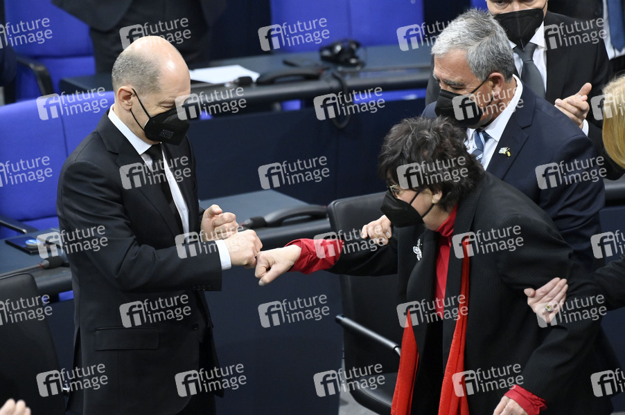 Olaf Scholz, Inge Auerbacher und Mickey Levy bei der Gedenkstunde zum Tag des Gedenkens an die Opfer des Nationalsozialismus anlässlich des Jahrestages der Befreiung des NS-Vernichtungslagers Auschwitz im Deutschen Bundestag im Reichstagsgebäude. Berlin, 27.01.2022