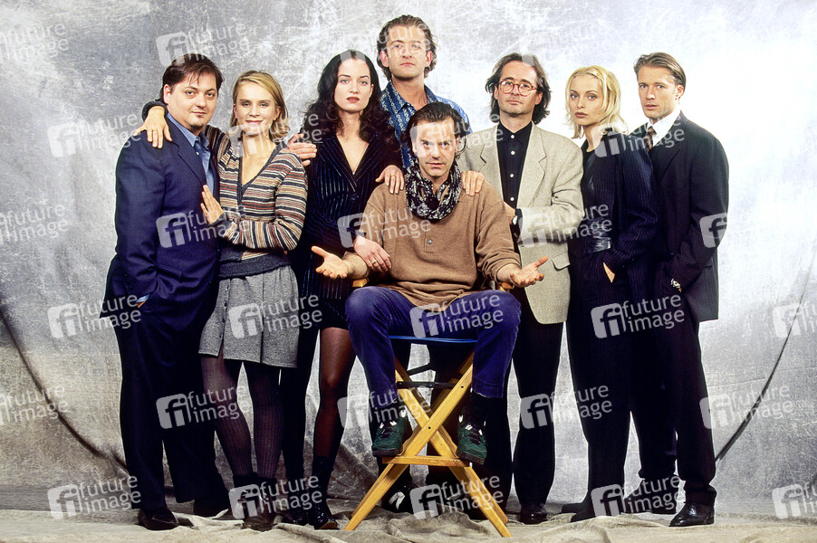Jürgen Tarrach, Susanne Schäfer, Natalia Wörner, Dominic Raacke, Ralf Huettner, Uli Aselmann, Catherine Flemming und Bruno Eyron bei einem exklusiven Fotoshooting zur Miniserie 'Um die 30' in einem Fotostudio in München im Sommer 1995. Die ZDF-Serie 'Um die 30' schilderte 1995 in sieben Folgen das Leben mehrerer Mittdreißiger in München. Bis Ende August 2021 wird mit dem selben Cast eine Fortsetzung in der Form eines 90 minütigen Fernsehfilms mit dem Titel 'Um die 50' gedreht.