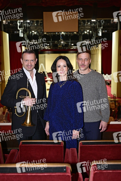 Till Brönner, Stephanie Stumph und Tom Wlaschiha bei der Pressekonferenz zum SemperOpernball 2025 in der Semperoper. Dresden,06.02.2025
