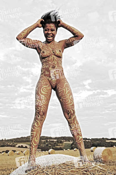Bodypainting, Erotik, Frau, Mädchen, Afrikanerien, nackt, draußen, weiblich, Körperkunst, Kunst, Ornamente, Malerei, Feld, Acker, Stoppelfeld, Heuballen, Stroh, Landwirtschaft, Ernte, Abendsonne, erotic, African woman, girl, nude, outdoor, female, body art, body painting, ornaments, field, hay, straw, farming, harvest, evening sun