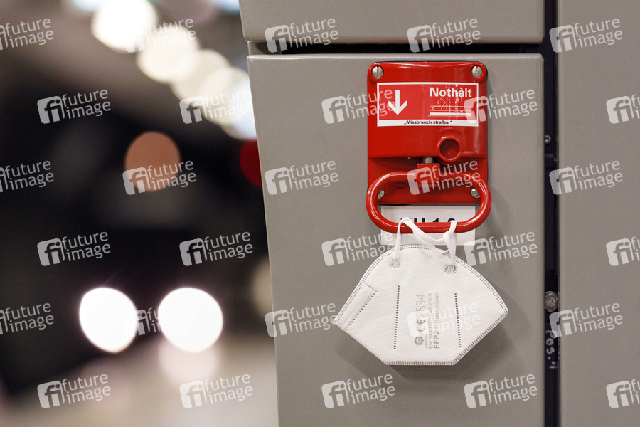 An einer Notbremse in einer Bahnhaltestelle hängt eine FFP2-Maske. Der Bundestag soll am kommenden Mittwoch über die sogenannte Bundes-Notbremse entscheiden. Die von der Bundesregierung geplanten Änderungen am Infektionsschutzgesetz sehen unter anderem eine nächtliche Ausgangssperre vor. (Themenbild, Symbolbild) Köln, 14.04.2021