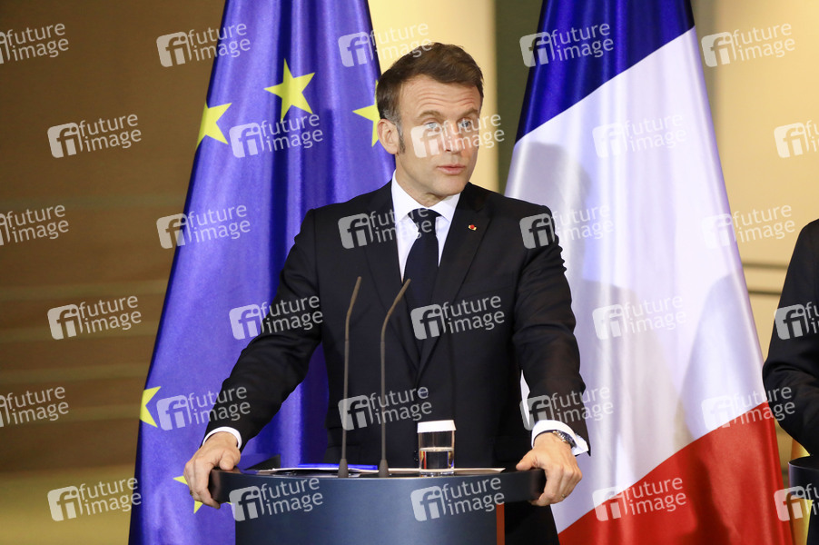 Emmanuel Macron beim Empfang des Staatspräsidenten der Französischen Republik zu einem gemeinsamen Gespräch mit dem Bundeskanzler mit anschließendem Pressestatement im Bundeskanzleramt. Berlin, 18.03.2025