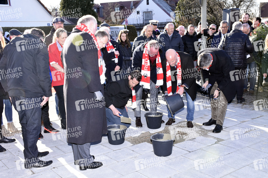 Uli Hoeneß, Karl-Heinz Rummenigge, Christian Vorländer und Herbert Haimer bei der Grundsteinlegung für eine Gedenkvitrine zum 62. Jahrestag des Flugzeugunglücks am damaligen Flughafen München-Riem, bei dem 23 Menschen ums Leben kamen, darunter acht Fußballspieler von Manchester United, am Manchesterplatz. München, 06.02.2020