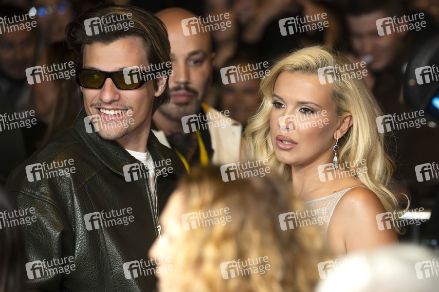 Jake Bongiovi mir Ehefrau Millie Bobby Brown bei der Premiere des Netflix-Films 'Estado eléctrico / The Electric State' im Cine Callao. Madrid, 27.02.2025
