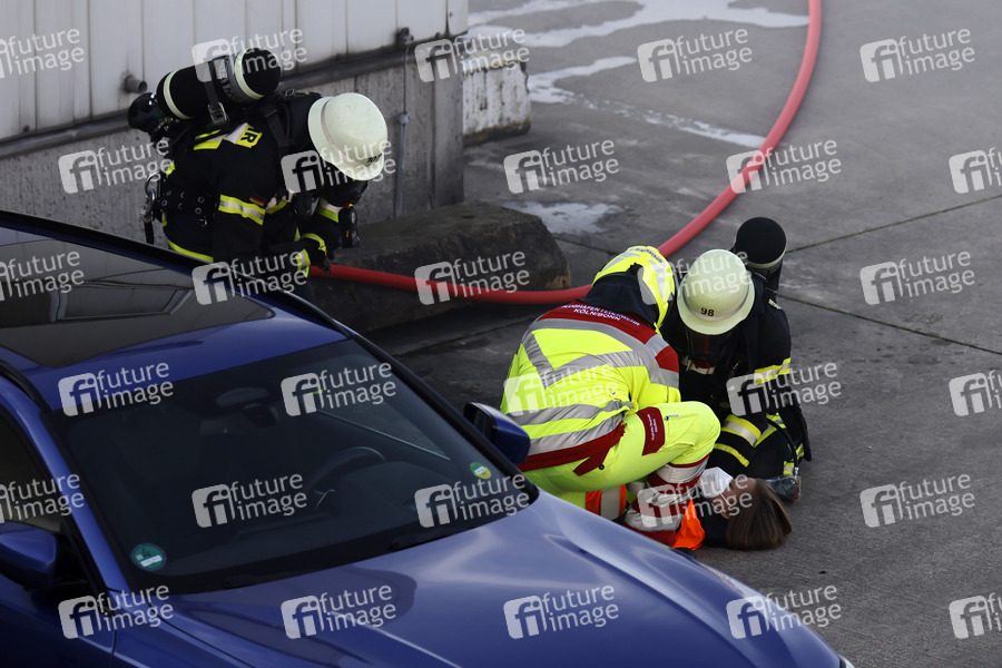 Einsatzkräftei der gemeinsamen ICAO-Notfallübung der Werkfeuerwehr, der Feuerwehr Köln, THW, Landespolizei, Bundespolizei und Bundeswehr am Köln Bonn Airport. Im Rahmen der Übung wird die Kollision eines Flugzeugs mit einem Passagierbus und einer Abfertigungshalle simuliert. Einsatzkräfte retten Verletzte aus dem in Brand geratenen Flugzeug. Köln, 06.11.2021