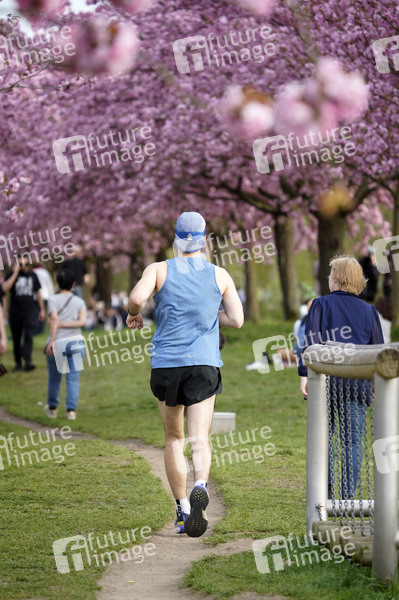 Blühende Japanische Kirschbäume entlang der TV-Asahi-Kirschblütenallee am Berliner Mauerweg im Stadtteil Lichterfelde und Teltow. Berlin, 07.04.2024