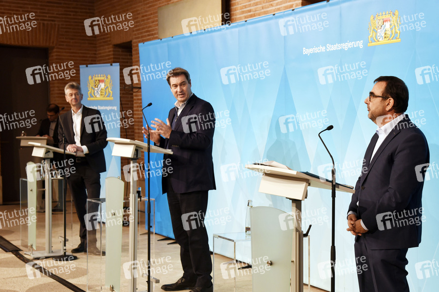 Pressekonferenz, PK, Corona-Pandemie, Sars-CoV-2, Covid-19, Coronavirus, Coronaviren, Corona-Virus, Coronakrise, Corona-Krise, Corona-Pandemie, Coronamaßnahmen, Maßnahmen, Ansteckung, Ansteckungsgefahr, Epidemie, Pandemie, Coronaregeln, Corona-Regeln, Corona-Schutz, Corona-Schutzmaßnahmen, Lock-Down, Lockdown, Politiker, Bayerischer Staatsminister für Unterricht und Kultus, Ministerpräsident von Bayern, Vorsitzender der CSU, Staatssekretär für Gesundheit und Pflege