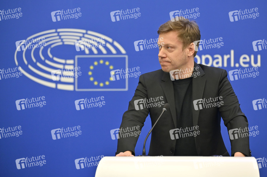Martin Schirdewan beim Pressebriefing der Fraktion Die Linke im Europäischen Parlament. Straßburg, 05.04.2022