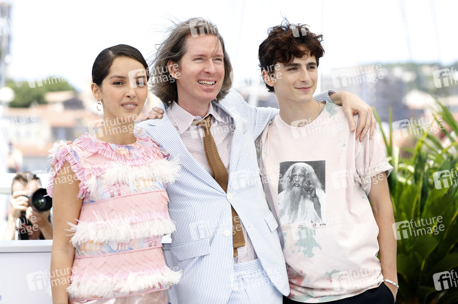 Lyna Khoudri, Wes Anderson und Timothee Chalamet beim Photocall zum Kinofilm 'The French Dispatch' auf dem Festival de Cannes 2021 / 74. Internationale Filmfestspiele von Cannes am Palais des Festivals. Cannes, 13.07.2021