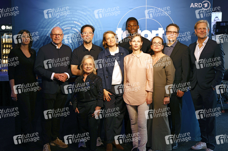 Sophie Seitz, Markus Lewe, Jan Josef Liefers, ChrisTine Urspruch, Isabel Prahl, Bineta Hansen, Bless Amada, Regine Bielefeldt, Alexander Bickel und Jan Kruse bei der Premiere des ARD Fernsehfilms 'Tatort - Fiderallala' im Cineplex. Münster, 02.04.2025