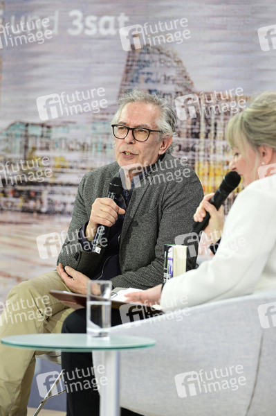 Ulrich Peltzer im Gespräch zu seinem Buch 'Der Ernst des Lebens' auf der ARD, ZDF und 3sat Literaturbühne auf der Leipziger Buchmesse 2024 auf dem Messegelände. Leipzig, 21.03.2024