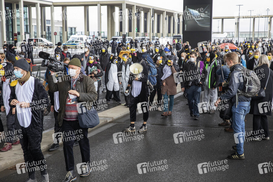 Protestaktionen von Mitgliedern des Bündnisses 'Am Boden bleiben' bei der Eröffnung des Flughafens Berlin-Brandenburg (BER). Schönefeld, 31.10.2020
