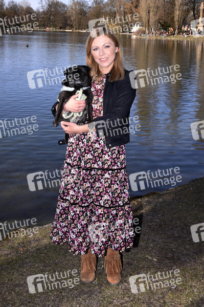 Anna Ewelina beim Spaziergang mit Hund Resi am Kleinhesseloher See im Englischen Garten. München, 28. 03.2021