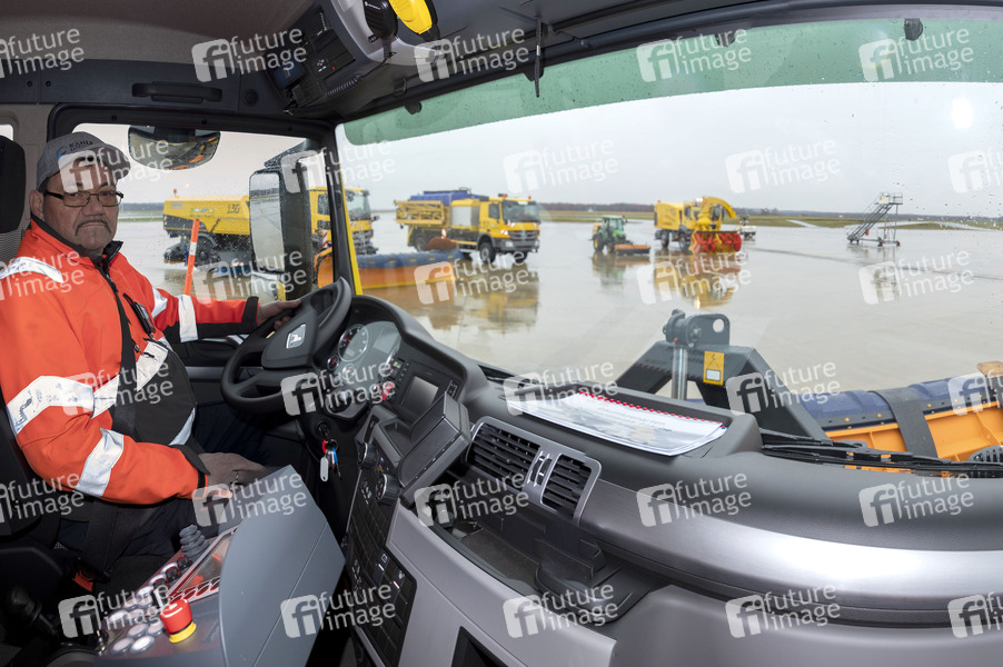 Im Schneeräumfahzeug beim Presse-Fototermin zum Winter-Fuhrpark des Flughafens Köln Bonn Airport. Köln, 11.12.2019