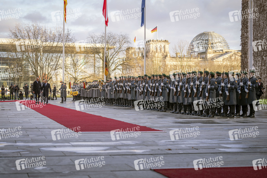 Friedrich Merz beim Empfang des polnischen Ministerpräsidenten Donald Tusk mit militärischen Ehren zu den 17. Deutsch-Polnischen Regierungskonsultationen im Bundeskanzleramt. Berlin, 01.12.2025