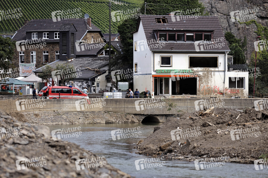 Nach dem Jahrhunderthochwasser in der Eifel durch heftige Regenfälle und Dauerregen mit Überschwemmungen und Überflutungen haben die Aufräumarbeiten im Ahrtal große Fortschritte gemacht. Einheiten von Polizei, THW, Bundeswehr und Feuerwehr mitsamt vielen freiwilligen Helfern haben Straßen geräumt, Schutt und Schlamm entfernt und die Menschen versorgt. Der Wiederaufbau wird trotzdem Jahre dauern. Im Bild Flutschäden in der Ortschaft Mayschoß, in der die Flut viele Häuser zerstörte, 08.08.2021