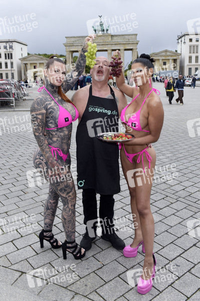 Inked Lorena, Egon Kowalski und Micaela Schäfer beim Fototermin zur Erotikmesse Venus Berlin 2025 am Brandenburger Tor. Berlin, 15.09.2025