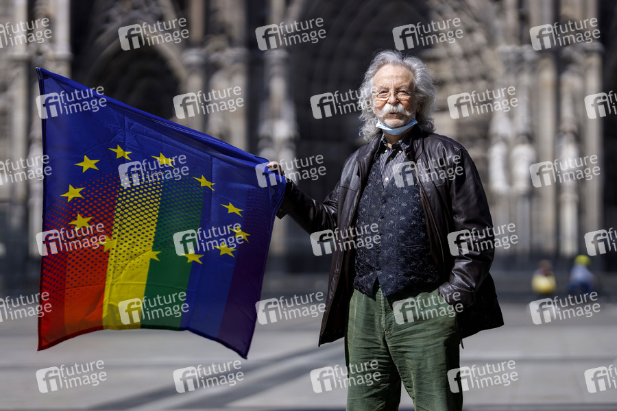 Jean Pütz zeigt eine Europa-Flagge, die in eine Regenbogenflagge übergeht, um die Bewegung Pulse of Europe zu unterstützen. Köln, 23.04.2021