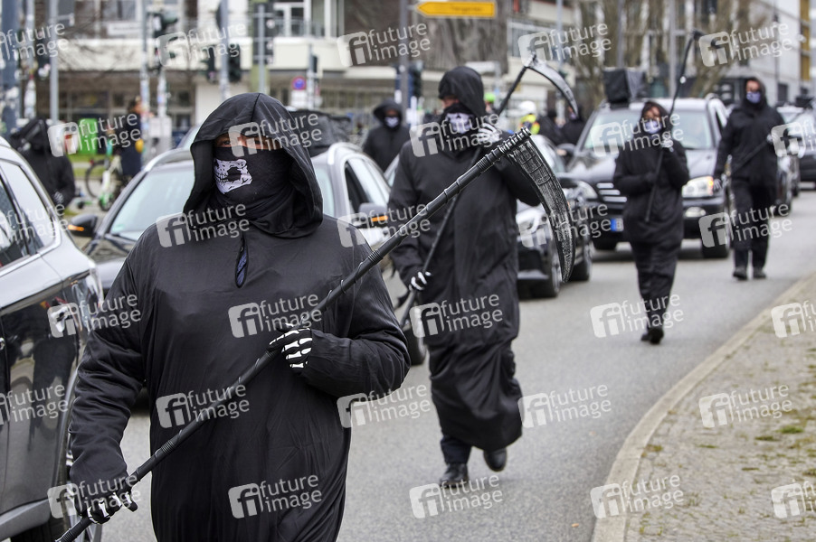 Als Sensenmänner verkleidet und mit Särgen protestieren Berliner Polizisten für eine Entschädigung nach der Schießstand-Affäre. Jahrelang trainierten Polizisten und Personenschützer an einem schadstoffbelasteten Schießstand. Einige verstarben an Krebs, andere sind schwer erkrankt. Berlin, 15.04.2021