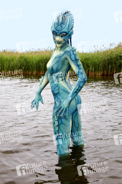 Bodypainting, Body-Painting, Erotik, Frau, Mädchen, nackt, Akt, weiblich, Körperkunst, Körperfarben, Farbe, Bemalung, Kunst, Malerei, Meer, See, Gewässer, Wasser, Monster, Ungeheuer, Fischwesen, Monster aus der Lagune, Schilf, Science Fiction, Sci-Fi, SciFi, Fantastic, Creature from the Black Lagoon, body painting, erotic, woman, girl, nude, female, body art, colors, sea, reed, lake, water, monster, fish being