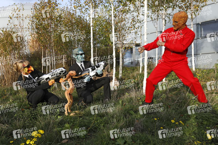 GEEK ART - Bodypainting and Transformaking: Men in Black Photoshooting mit Maria Skupin und Paul Skupin als außerirdische MIB mit Neeble und Enrico Lein als Corn Face im Expo Park in Hannover. - Ein Projekt des Fotografen Tschiponnique Skupin und des Bodypainters und Transformakers Enrico Lein