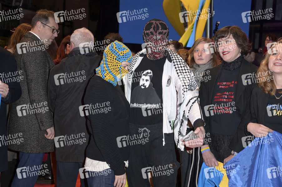 Oleksii Makeiev, Mariette Rissenbeek, Claudia Roth und Carlo Chatrian demonstrieren zusammen mit ukrainischen Filmemachern und Mitgliedern der Intarnationalen Jury ihre Solidarität mit der Ukraine auf dem Roten Teppich vor dem Berlinale-Palast auf der Berlinale 2023 / 73. Internationale Filmfestspiele Berlin. Berlin, 24.02.2023
