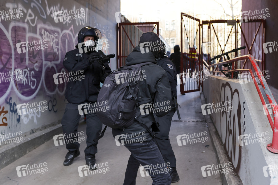 Gegen 8.30 Uhr wurde die Kiezkneipe 'Meuterei' in Kreuzberg von der Polizei geräumt. Linke Gruppen haben für Donnerstag fünf Demos, davon drei mit dem Zielort vor der besetzten Kneipe, angekündigt. Seit Mittwochnachmittag hat die Polizei deshalb eine Sperrzone um die Kneipe gezogen. 1100 Einsatzkräfte sicherten die Räumung der Kiezkneipe ab. Berlin, 25.03.2021