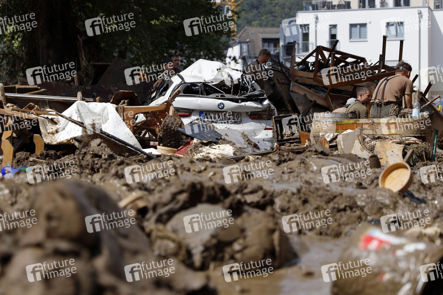 Nach dem Jahrhunderthochwasser in der Eifel durch heftige Regenfälle und Dauerregen mit Überschwemmungen und Überflutungen haben die Aufräumarbeiten im Ahrtal begonnen. Einheiten von Polizei, THW, Bundeswehr und Feuerwehr mitsamt vielen freiwilligen Helfern räumen Straßen, entfernen Schutt und Schlamm und versorgen die Menschen. Im Bild zerstörte Häuser und Autos in der Ortschaft Altenahr, in der die Flut viele Häuser zerstörte, 22.07.2021