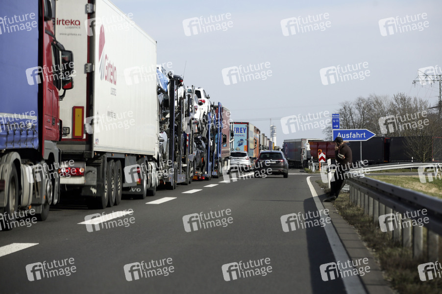 LKWs stehen auf der A12 in Fahrtrichtung Polen im Stau. Die Grenzen zwischen Polen und Deutschland sind wegen des Coronavirus geschlossen. Frankfurt (Oder), 16.03.2020