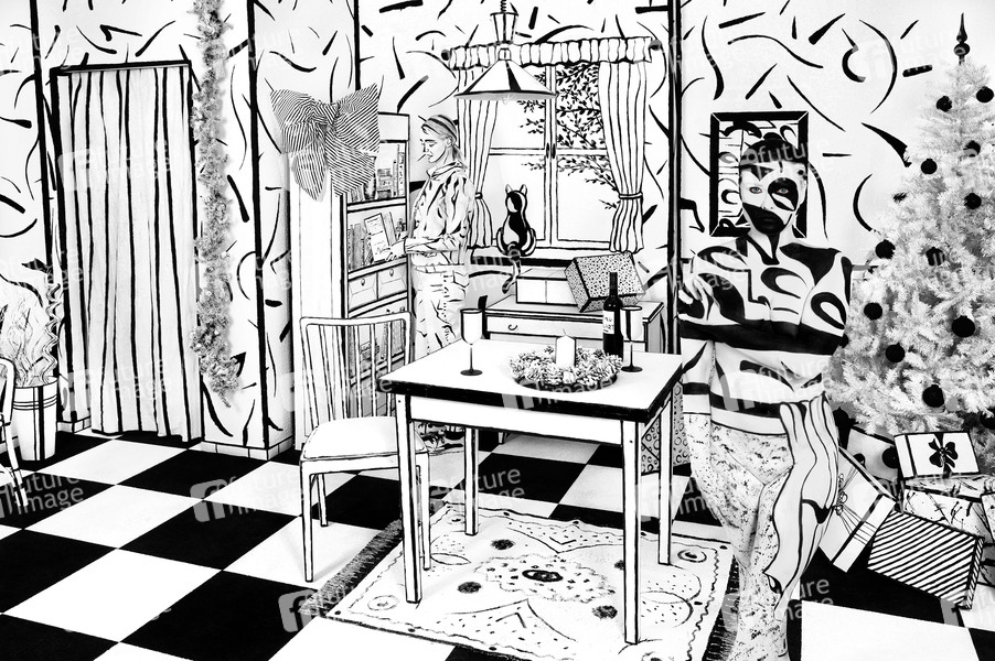 (Black and) White Christmas Photoshooting mit den Models Tina als Akteurin und Tatjana Heinz getarnt am Bilderrahmen im Atelier Düsterwald. Hameln, 08.12.2024 - Bodypainting und Kulisse von Jörg Düsterwald