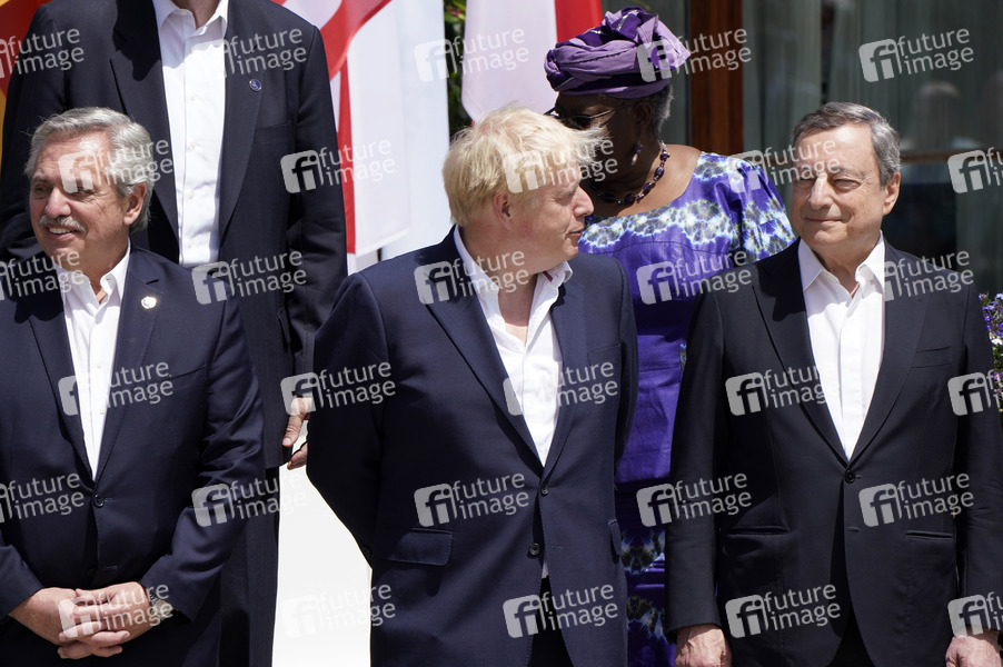 Alberto Fernandez, Boris Johnson und Mario Draghi beim Fototermin zum erweiterten Familienfoto im Rahmen der Outreach-Arbeitssitzung am zweiten Tag des G7-Gipfels auf Schloss Elmau. Die Staats- und Regierungschefs der G7-Gruppe kommen offiziell unter dem Motto 'Fortschritt hin zu einer gerechten Welt' zusammen und werden globale Themen wie Krieg, Klimawandel, Hunger, Armut und Gesundheit diskutieren. Der Gipfel wird vom anhaltenden russischen Krieg gegen die Ukraine überschattet. Klais, 27.06.2022