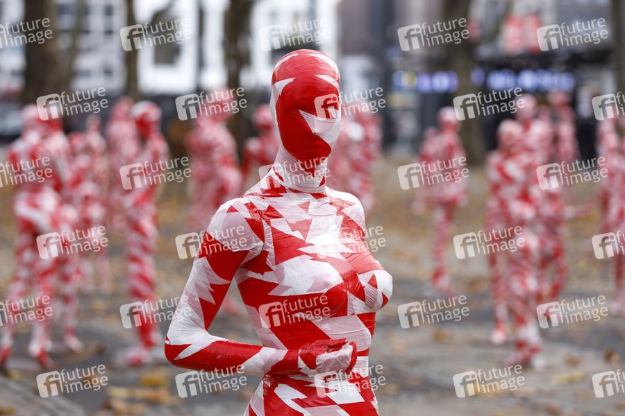 Kunst-Installation 'It is like it is - Mahnmal zur Coronakrise - 2020', einer Installation aus 111 maskierten Schaufensterpuppen, von Dennis Josef Meseg anlässlich der strengen Maßnahmen der Bundesregierung wegen der Coronakrise auf dem Neumarkt. Köln, 11.11.2020