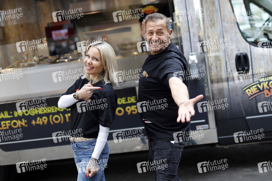 Miss Sugar und Willi Herren bei der Eröffnung von 'Willi Herren's Rievkooche Bud'. Willi Herren stellt seinen Reibekuchen-Truck am Gelände der Selgros vor. Köln, 16.04.2021