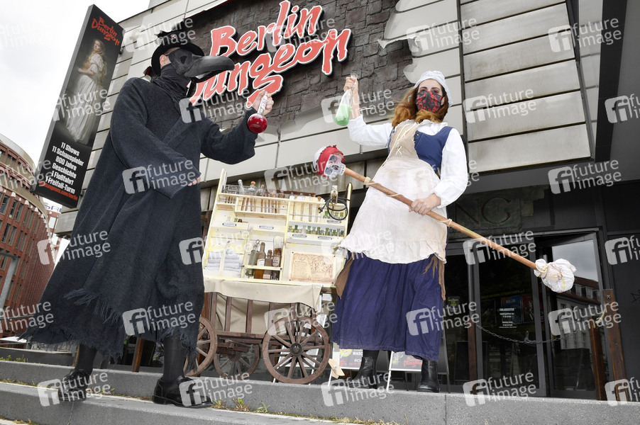 Der Pestarzt und seine Assistentin mit Stinkestab und dem Allheilmittel Theriak bei der Wiedereröffnung des Berlin Dungeon. Berlin, 09.07.2020