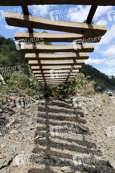 Nach dem Jahrhunderthochwasser in der Eifel durch heftige Regenfälle und Dauerregen mit Überschwemmungen und Überflutungen haben die Aufräumarbeiten im Ahrtal große Fortschritte gemacht. Einheiten von Polizei, THW, Bundeswehr und Feuerwehr mitsamt vielen freiwilligen Helfern haben Straßen geräumt, Schutt und Schlamm entfernt und die Menschen versorgt. Der Wiederaufbau wird trotzdem Jahre dauern. Im Bild Flutschäden nahe der Ortschaft Rech, in der die Flut viele Häuser zerstörte, 30.07.2021