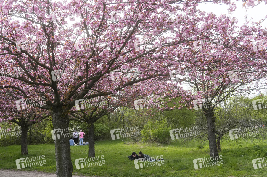 Blühende Japanische Kirschbäume entlang der TV-Asahi-Kirschblütenallee am Berliner Mauerweg im Stadtteil Lichterfelde und Teltow. Berlin, 07.04.2024