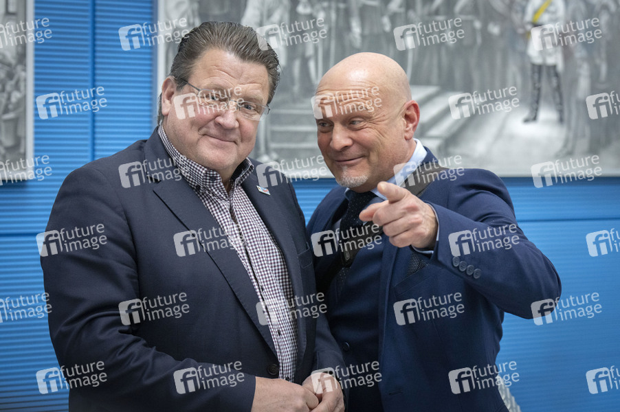 Stephan Brandner und Enrico Komning beim Pressestatement zur Fraktionssitzung der AfD-Bundestagsfraktion im Reichstagsgebäude. Berlin, 10.02.2025