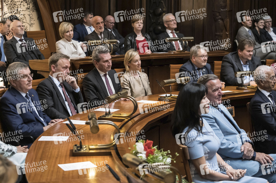 Schröder-Kim So-yeon, Gerard Schröder und Gäste beim Empfang zum 75. Geburtstag von Ehrenbürger und Bundeskanzler a.D. Gerhard Schröder im Neuen Rathaus. Hannover, 24.04.2019