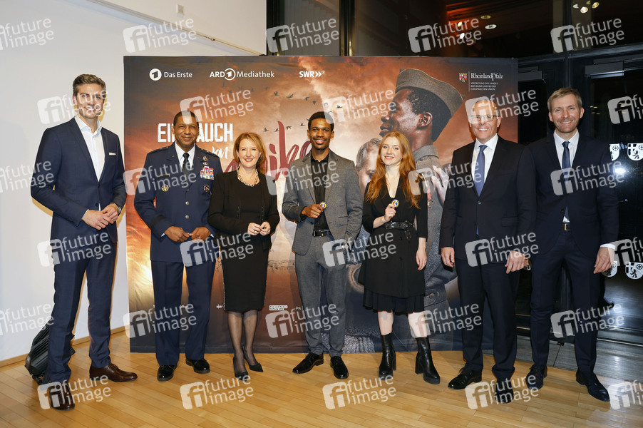 Ingo Zamperoni, Major General Randall Reed, Gast, Reomy D. Mpeho, Franziska Brandmeier, Peter Beyer und Ben von Rönne bei der Preview der Fernsehserie 'Ein Hauch von Amerika' in der Vertretung des Landes Rheinland-Pfalz beim Bund. Berlin, 23.11.2021