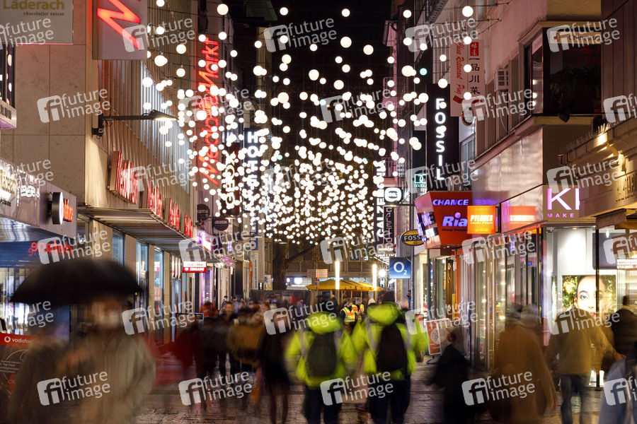 Passanten laufen mit Masken durch die Hohe Straße, wo schon Weihnachtsbeleuchtung und Weihnachtsdekoration hängen. Aufgrund der Corona-Pandemie gelten in Kölner Einkaufszonen Corona-Regeln wie etwa die Maskenpflicht oder das Einhalten von Mindestabstand. (Symbolbild, Themenbild) Köln, 06.12.2020