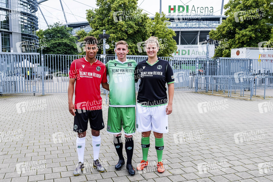 Linton Maina, Niklas Tarnat und Anna-Lena Füllkrug bei der Präsentation der Hannover 96-Trikots des neuen Ausrüsters Macron für die Saison 2019/20 in der HDI Arena. Hannover, 16.06.2019