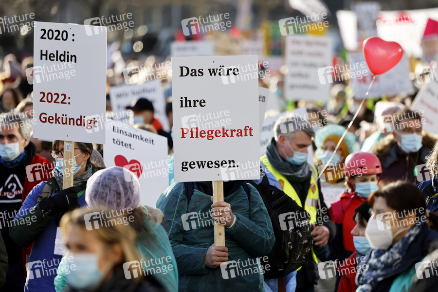Bei einer angemeldeten Demo unter dem Motto 'Freie Impfentscheidung, Herr Lauterbach!' demonstrierten Tausende Gegner einer Impfpflicht mit einem Spaziergang gegen die Corona-Maßnahmen der Bundesregierung und für eine individuelle Impfentscheidung, Grundrechte und 'unversehrte' Kinder - darunter auch viele Pflegekräfte, die wegen der Impfpflicht im Gesundheitsbereich ihren Job zu verlieren drohen. Düsseldorf, 26.02.2022
