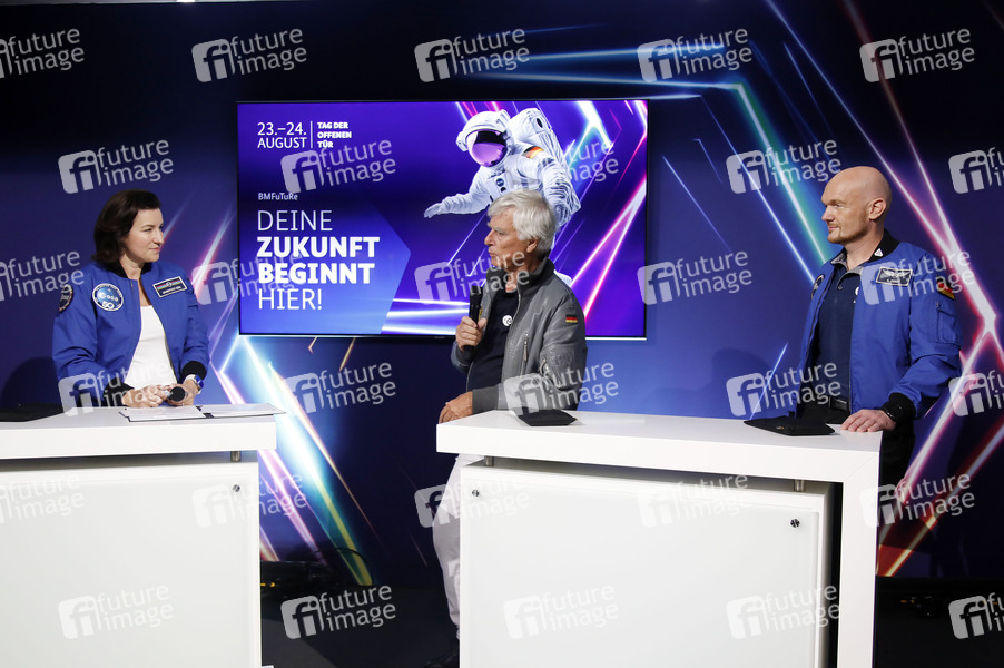 Dorothee Bär, Ulf Merbold und Alexander Gerst beim Tag der offenen Tür der Bundesregierung im Bundesministerium für Forschung, Technologie und Raumfahrt. Berlin, 23.08.2025