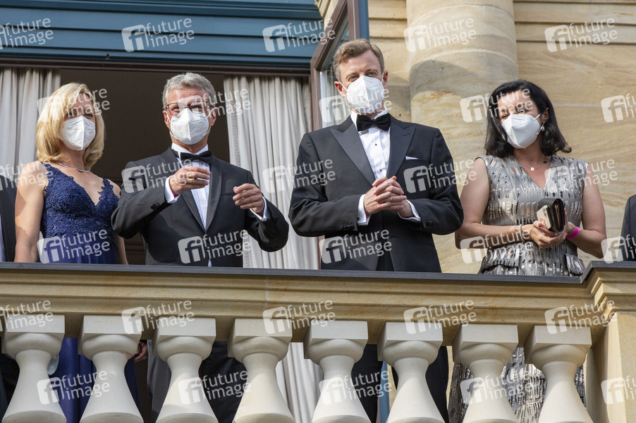 Bernd Sibler mit Ehefrau Michaela und Dorothee Bär mit Ehemann Oliver Bär bei der Eröffnung der Richard-Wagner-Festspiele 2021 mit der Premiere von Richard Wagners 'Der fliegende Holländer' im Bayreuther Festspielhaus. Bayreuth, 25.07.2021