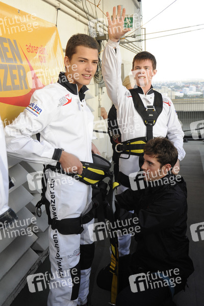 Base Flying von Jochen Schweizer mit den Hauptdarstellern von 'Gangs' auf dem Park Inn Hotel am Alexanderplatz in Berlin