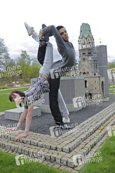 Fototermin zu 'Made in Berlin', der neuen Show im Wintergarten. Die jungen Artisten Eike von Stuckenbrok, David Pereira, Mareike Koch und das Duo Dennis und Lea zeigen einige ihrer Kunststücke im Modellpark Berlin in der Wuhlheide