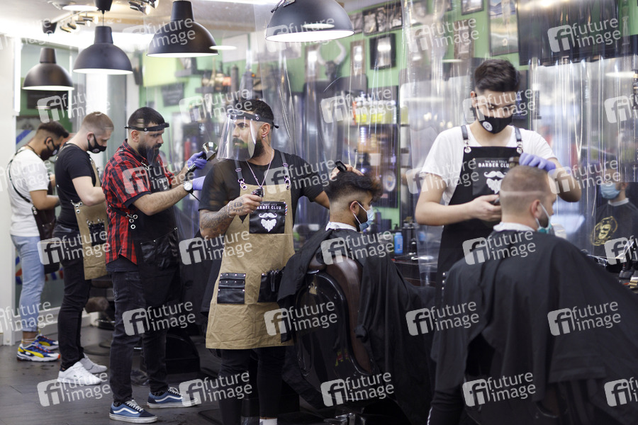 Barber, Barbier, Barber-Shop, Barber-Shops, Friseur, Friseure, Corona-Maßnahmen, Coronakrise, Corona-Krise, Schutzkleidung, Spritzschutz, Frisör, Salon, Bart schneiden, Bartschnitt, Haare schneiden, Haarschnitt, Fönen, Waschen, Legen, Corona, Virus, Sars-CoV-2, Covid-19, Coronavirus, Corona-Virus, Coronaviren, Corona-Viren, Pandemie, Epidemie, RKI-Zahlen, Neuansteckungen, Corona-Lockerungen, zurück zur Normalität, Corona-Schutz, Exit-Strategie, Friseurbesuch, Ausnahmesituation, Atemschutz, Atemschutzmaske, Virenschutz, Schutzmaske, Schutzmasken, Atemschutzmasken, Maske, Masken, Mundschutz, Mund-Schutz, Mundschutzpflicht, Maskenpflicht, Mundschutz-Pflicht, Mund-Nase-Schutz, Mund-Nasen-Schutz, MNS, Corona-Regeln, Symbolbild, Symbolfoto